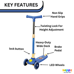The Keppz Lightweight and stable 3 wheel kick scooter by Keppz for kids aged 3 to 8 years Features a colorful design wide base rear foot brake and height adjustable handle bar for growing riders