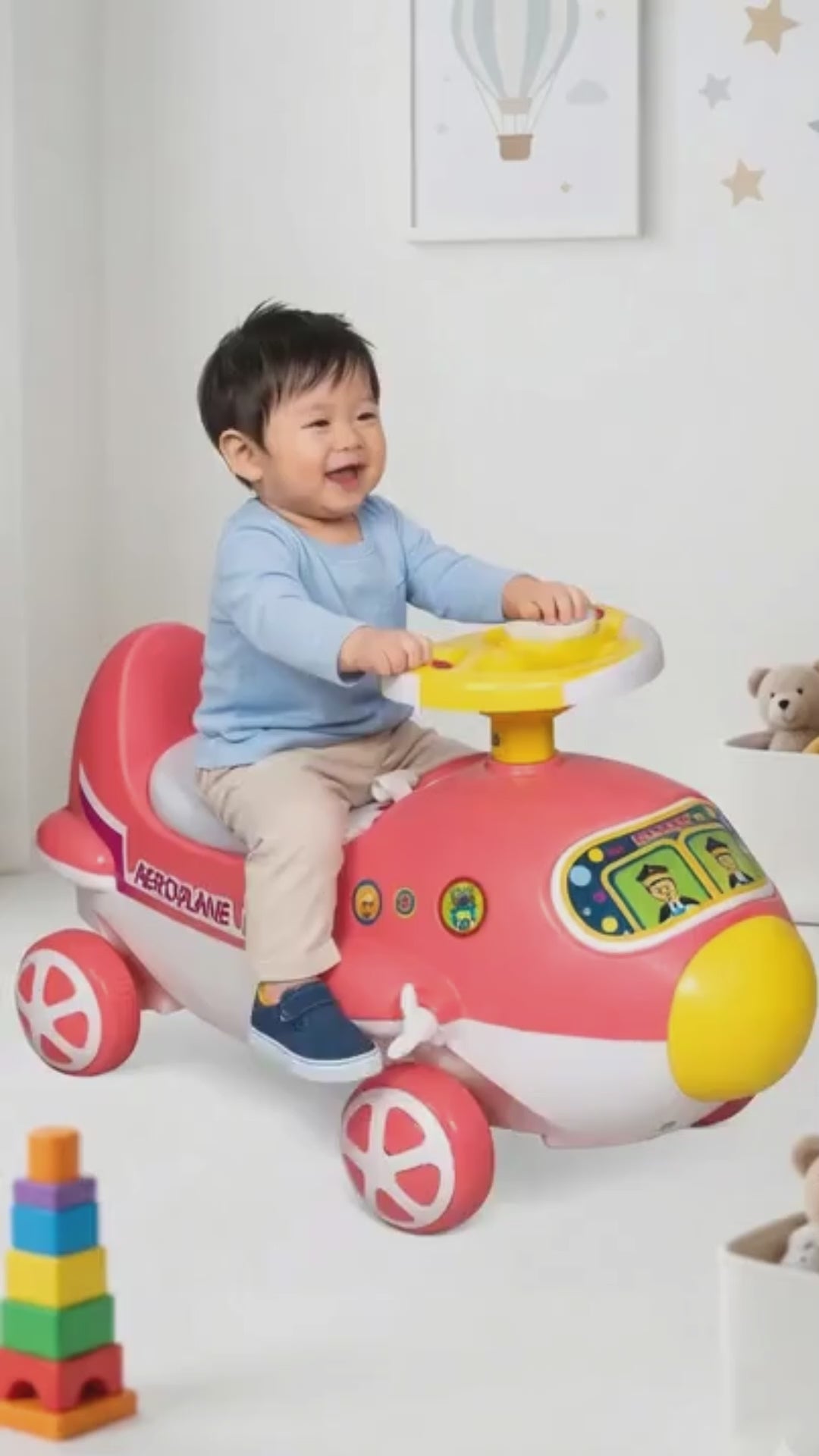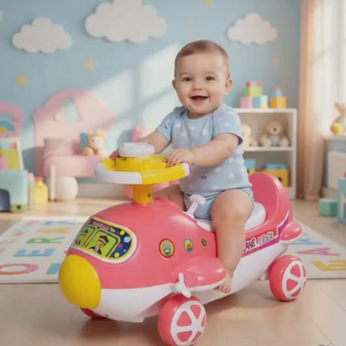 • Sturdy ride-on push toy supports balance and early motor skill development. • Aeroplane-themed design encourages imaginative and creative playtime. • Comfortable seat and easy steering ensure safe and enjoyable riding. • Smooth wheels and durable build suitable for indoor and outdoor use. • Bright and attractive colors keep kids engaged and excited to ride and play.
